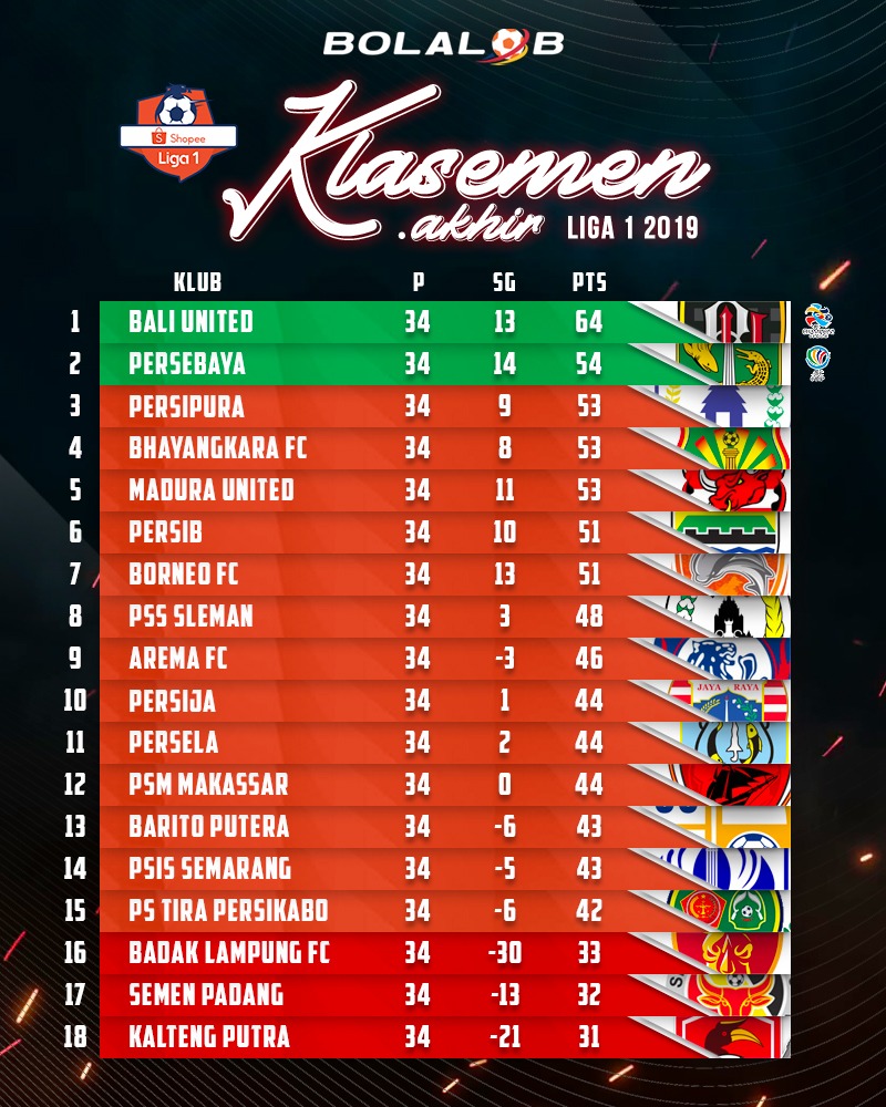 Bhayangkara Fc! 3, arema, 16, 9, 6, 1, 11, 33 .
